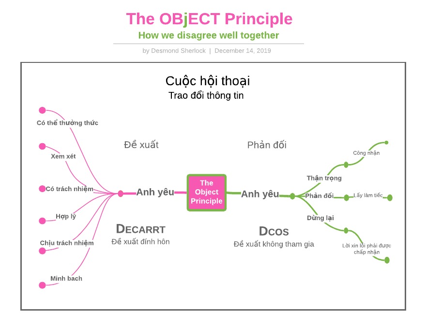 So how do we make this exchange fair and equal, where we both gain more than we put in? Well, for exchanging pleasantries we generally use reasonably standard social mores to help as there is not much to be lost and gained. But for grand proposals it is a different matter, where we could lose or gain possibly hundreds of thousands of dollars, or even our life and the lives of our future children could be lost. It is in this area where we are going to need more explicit agreements, in my view, on how we go about both engaging and disengaging with our proposals. This is where the Object Principle comes in.