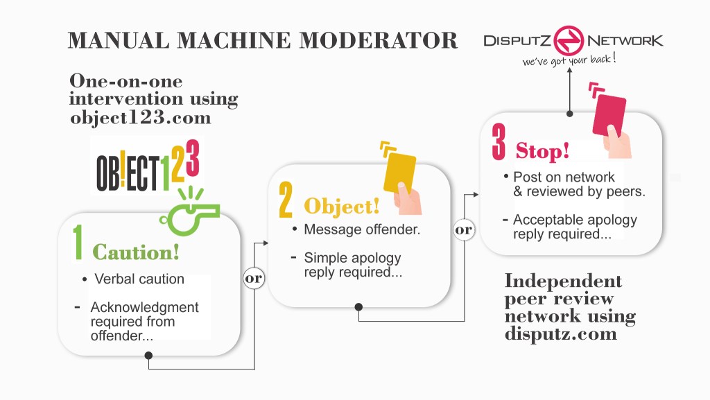 At present, Object123 facilitates users to self-moderate their discussions by allowing them to object, in real-time, to any perceived infringement, misconduct, or poor behavior during a discussion. Object123 allows team members and team leaders to speak up by OBJECTING to any poorly delivered feedback on an idea, with an agreed-upon, three-step procedure.