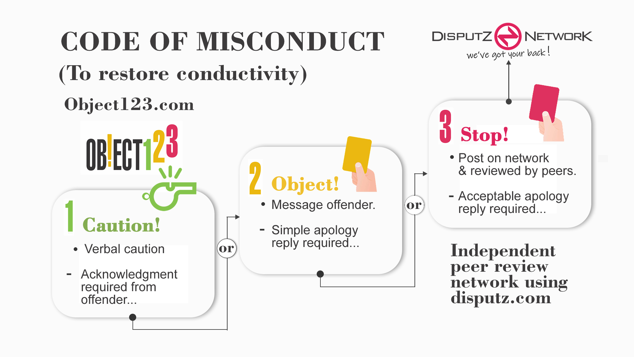 So, how do we restore the disconnect caused by the misconduct? I suggest we use our Object123, a self-managing, code of misconduct.