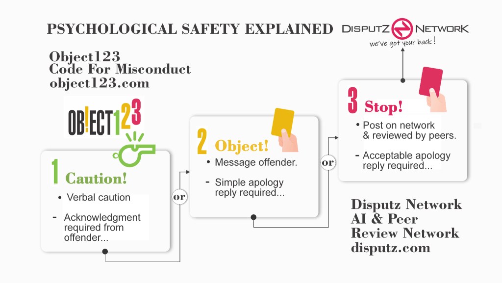 We simply agree to OBJECT to anyone’s behavior, in real-time and direct, when we are in a disagreement and someone tries to close us down. We also do it in three steps, of course, from a mild Caution to a full-on Stop. I call this the Object123 Code of Misconduct and it goes like this: