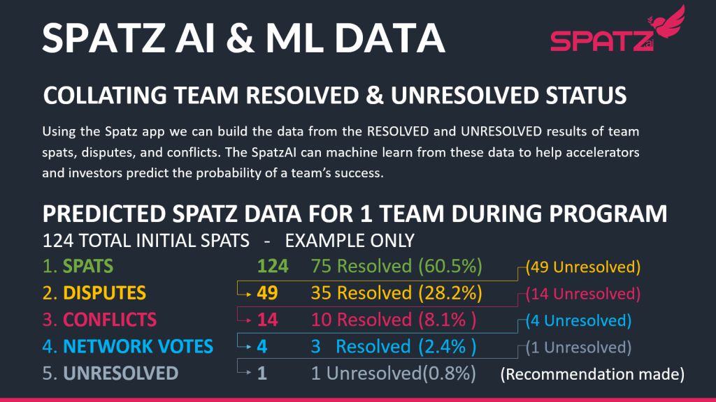 Third: Use the anonymous data through the SpatzAI, detailing the team’s resolved and unresolved spats, disputes and conflicts. Allowing organizations, and investors to protect their investments, predicting the success or failure of a team by correlating the data with teams’ performance.
