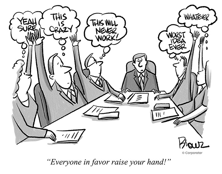 “Groupthink is a psychological phenomenon that occurs within a group of people in which the desire for harmony or conformity in the group results in irrational or dysfunctional decision-making outcomes. Cohesiveness, or the desire for cohesiveness, in a group may produce a tendency among its members to agree at all costs. This causes the group to minimize conflict and reach a consensus decision without critical evaluation.” Wikipedia