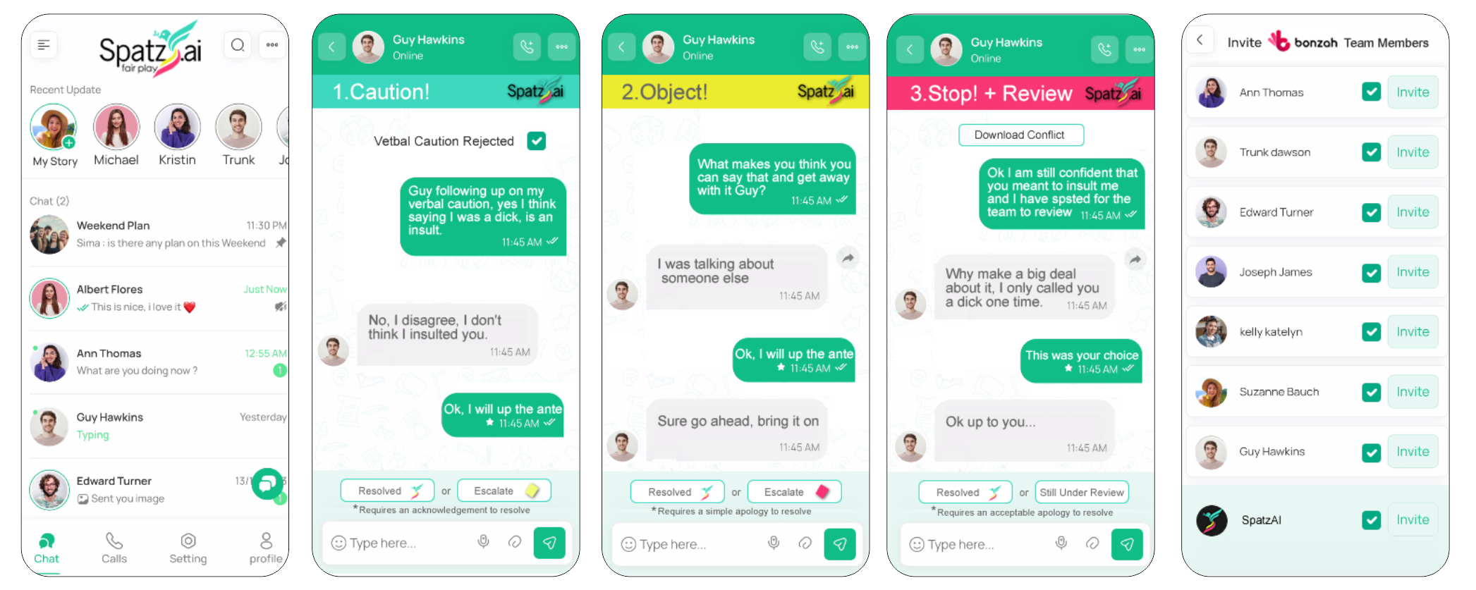 In the initial stage, a team member can issue a verbal caution when experiencing problematic behavior from a coworker or manager. If the caution is challenged or ignored, the offended party can use the SpatzAI app, at an appropriate time, to send an official “Caution,” to document their spat. Should the issue remain unresolved, it escalates to an “Objection,” requiring a simple apology from the offending party. The final stage, “Stop,” involves a team-assisted review process where the conflict is assessed by the team, leading to a heartfelt and acceptable apology for the resolution.
