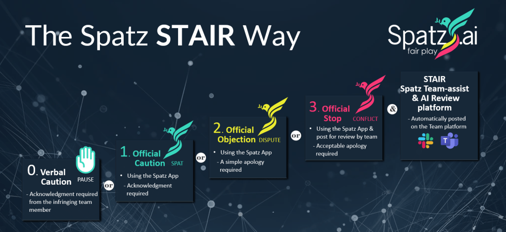 The STAIR way to resolving conflicts refers to the Spatz Team-assist & AI Review (STAIR) platform, a cutting-edge concept designed to address micro-conflicts before they escalate into larger workplace issues. Built on the Spatz Chat app, the review platform, STAIR provides a structured approach for teams to identify, track, and ultimately resolve objectionable behavior in a fair and transparent manner.