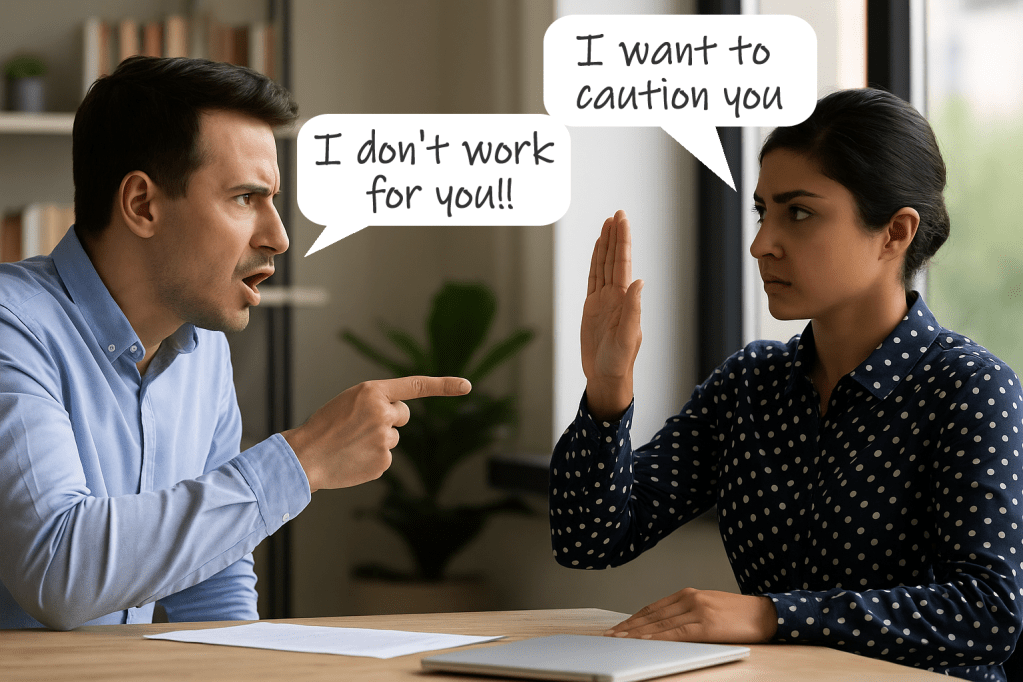 “So, what does one say and do when someone says ‘I don’t work for you’? Obviously they felt you crossed their line. And obviously you felt your line had been crossed by their comment. What happens next?”